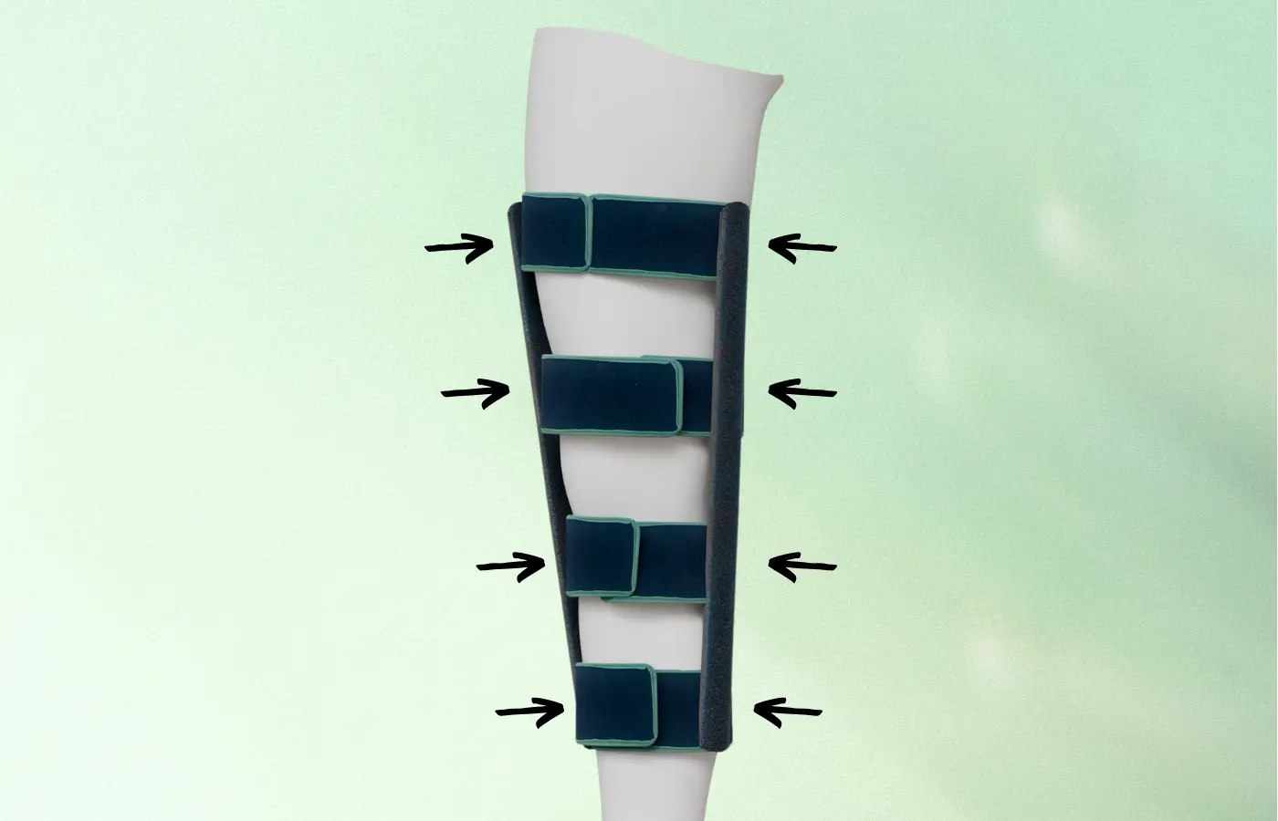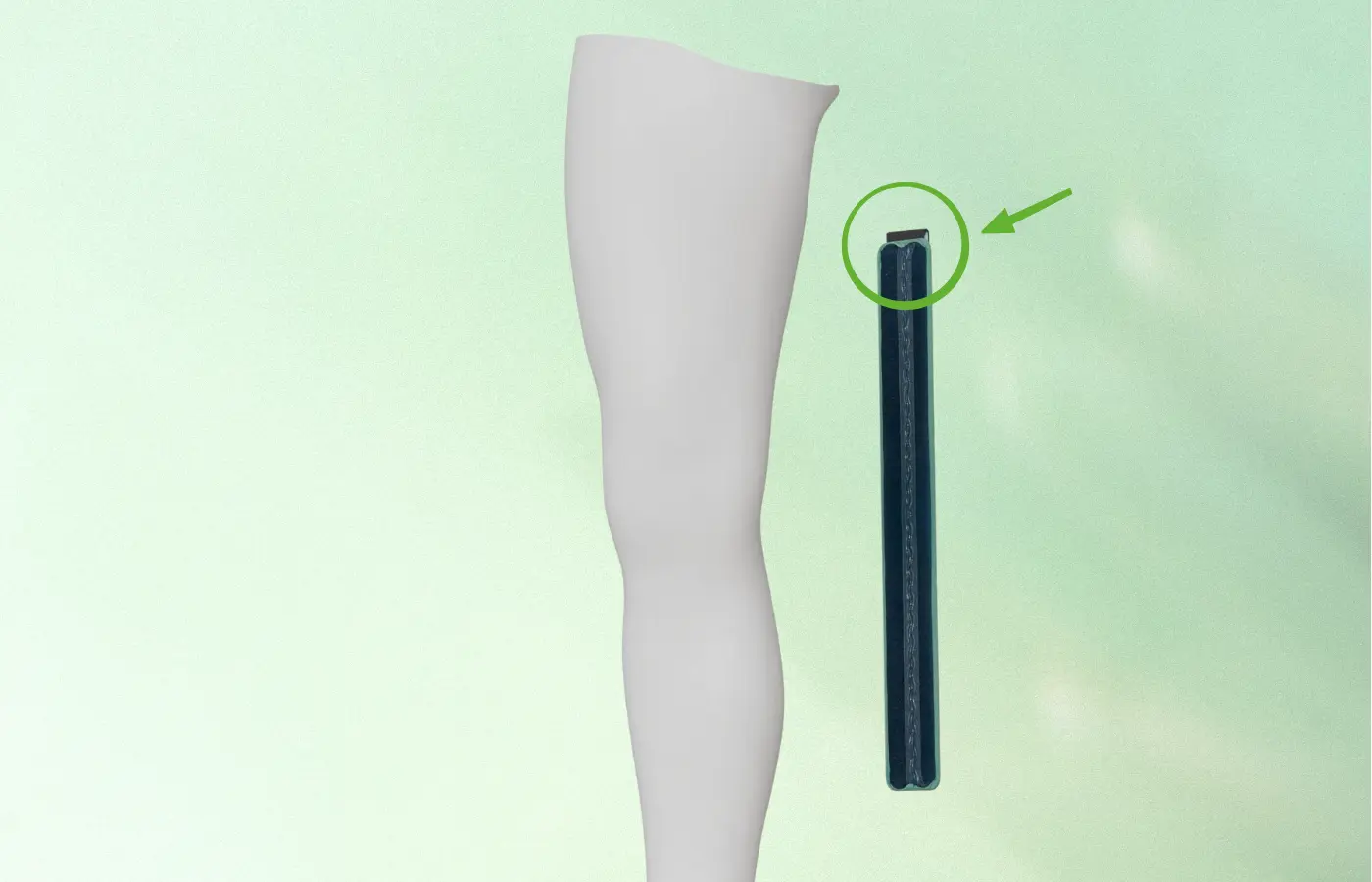 Repérez le petit scratch en haut : il indique le haut de la jambe, côté cuisse. Positionnez la baleine à l’arrière de la jambe, bien centrée. Les bandes viendront ensuite se fixer par-dessus, au milieu de cette baleine.