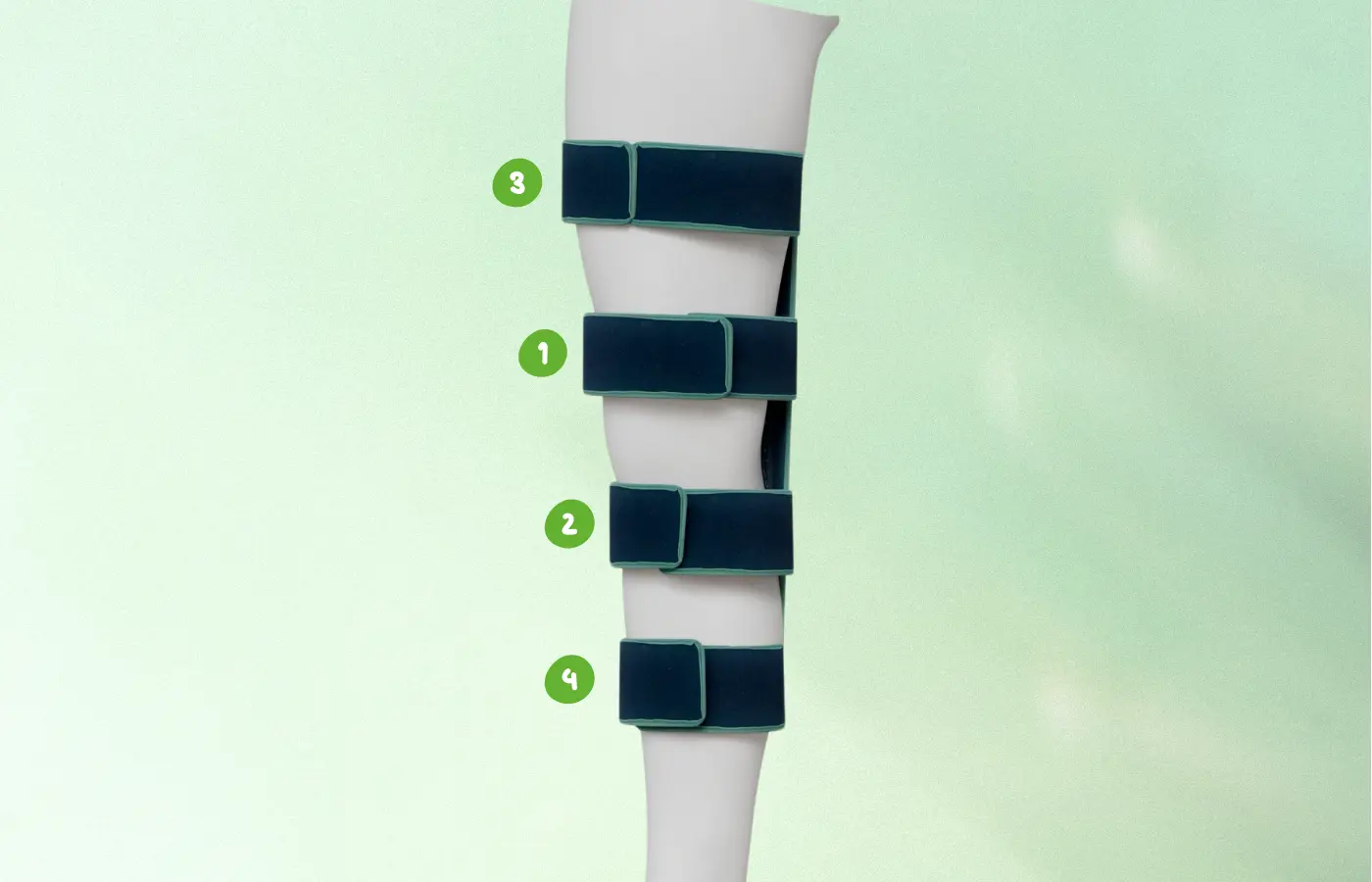 Positionnez les 4 bandes dans l’ordre : commencez par celles au-dessus et en dessous du genou (1 et 2), puis fixez les bandes haute (3) et basse (4). Serrez bien la bande au-dessus du genou pour éviter le glissement.