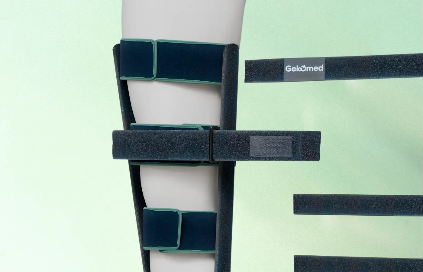 Utilisez les sangles longues en haut, les courtes en bas. Entourez la jambe et fixez avec le scratch double-face en bout de sangle pour plus de confort. Le logo Gekomed figure sur la bande la plus haute.